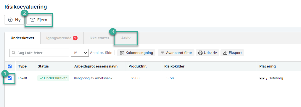 Hvis risikovurderingen ikke længere er relevant for driften, og arbejdsprocessen ikke længere udføres, kan du arkivere risikovurderingen.