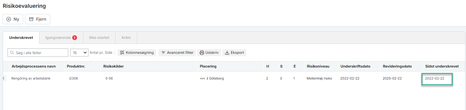 Når en risikovurdering ændres og underskrevet, oprettes der en ny version af vurderingen. For at se tidligere versioner skal du klikke på udgivelsesdatoen.