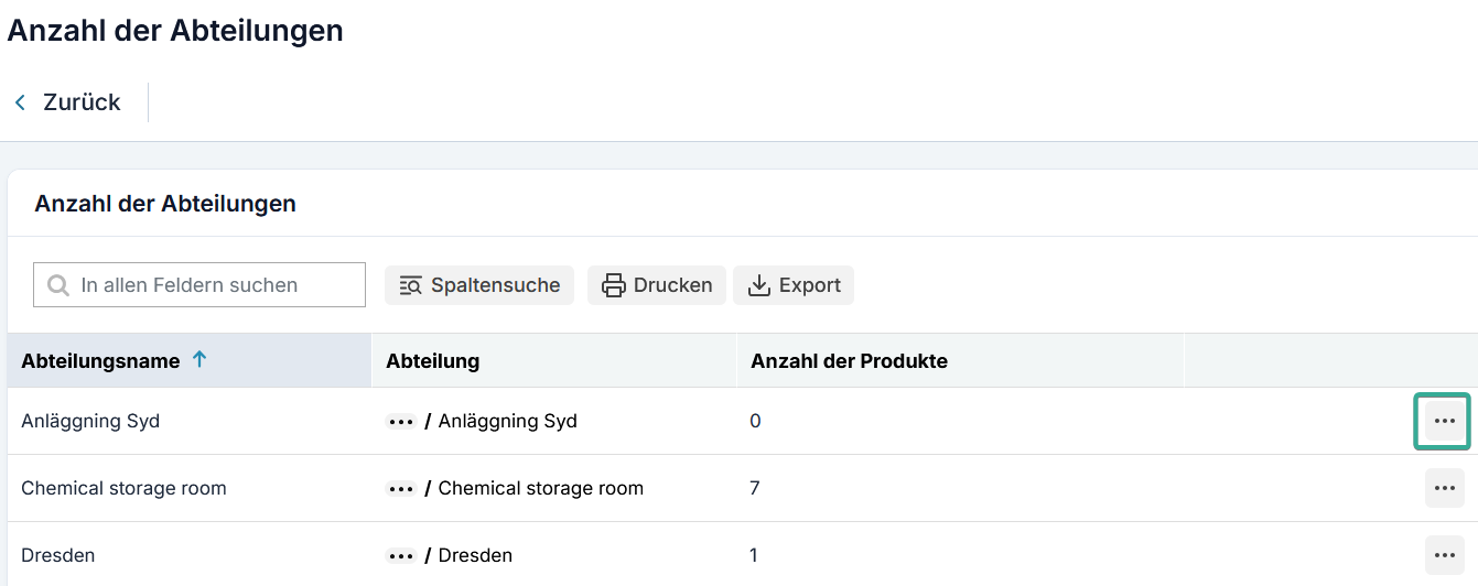 Die Funktion "Abteilungen, die nicht für die Inventarisierung vorgesehen sind" identifiziert abteilungen, die keine Produkte unter ihrem Inventar aufgeführt haben sollten. Dies ist besonders nützlich für Verwaltungs- oder Supportabteilungen, die nicht mit chemischen Produkten umgehen s. Um eine genaue Bestandsverwaltung zu gewährleisten, empfehlen wir Ihnen, alle abteilungen, in denen es keine Produkte geben soll, als "In dieser Abteilung ist kein Bestand erlaubt. Aus dem Überblick ausschließen." in der Abteilung zu markieren (siehe "Weitere Aktionen" unten).