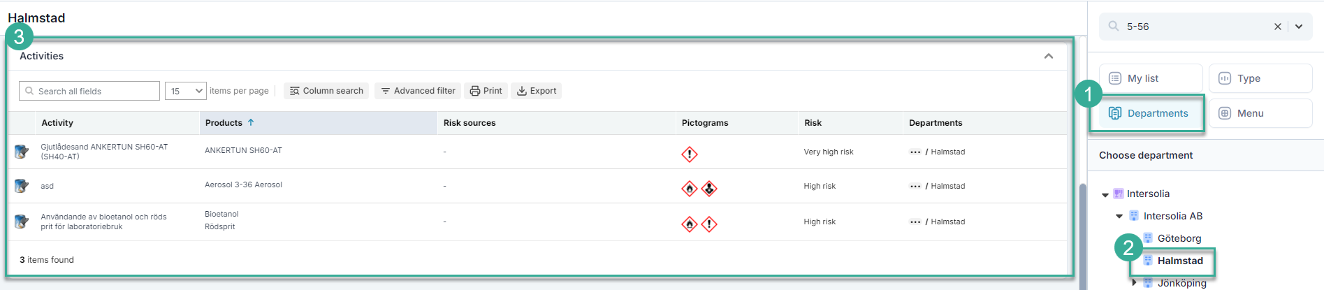 Voit löytää aktiviteettisi etsimällä riskin arvioinnin nimeä tai valitsemalla osastosi.aktiviteetti / arviointi nimi listataan.