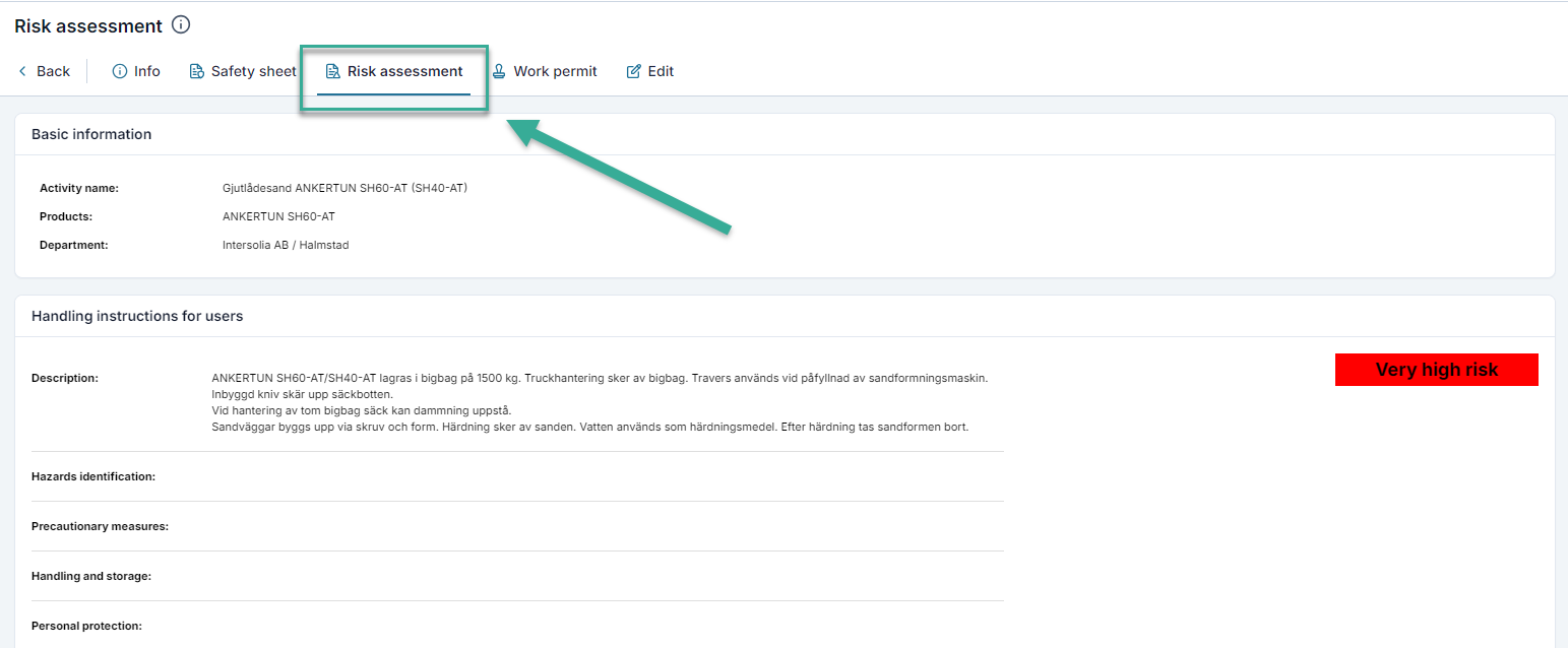 Napsauttamalla aktiviteetti pääset Info-sivulle, joka näyttää yhteenveto arviointi ja myös lasketuista riskeistä. Näet piktogrammit, luokituksen, vaaralausekkeet, turvalausekkeet ja tuotteet, jotka sisältyvät arviointi.