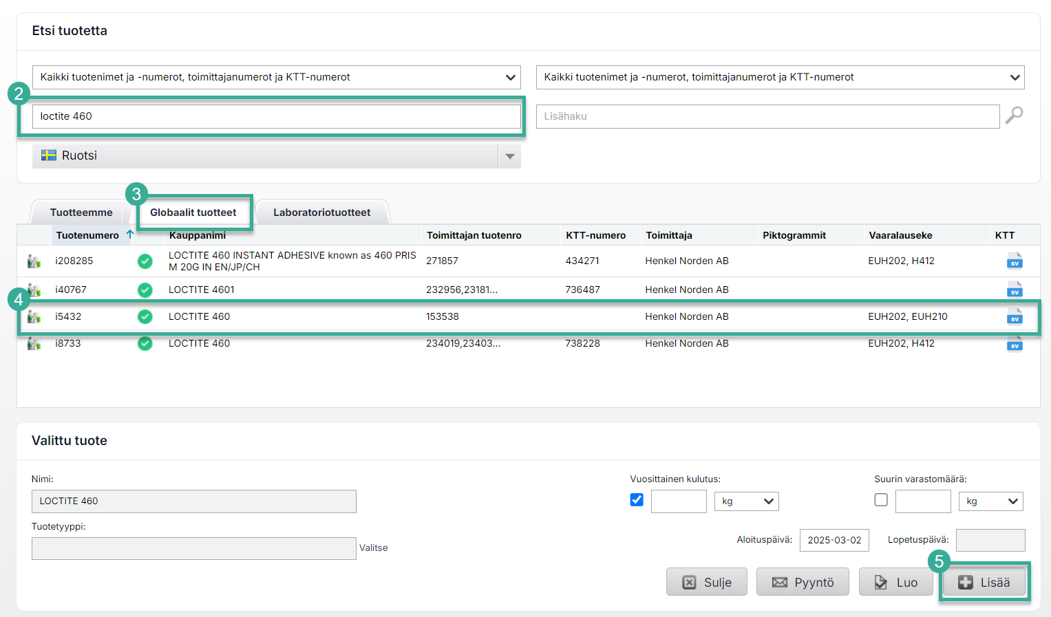2. Etsi vasemmasta hakukentästä tuotteen nimi, tuotenumero tai toimittaja.