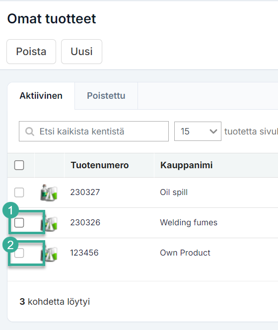 Välilehdellä Työkalut > Omat tuotteet löydät tuotteet, jotka olet itse luonut iChemistry. Sieltä voit myös luoda uusia omia tuotteita.
