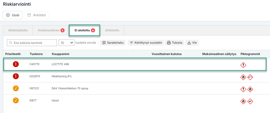 Kopioidaksesi aiemmin allekirjoitetun riskinarvioinnin, aloita napsauttamalla uutta tuotetta " Ei aloitettu " -listassa.