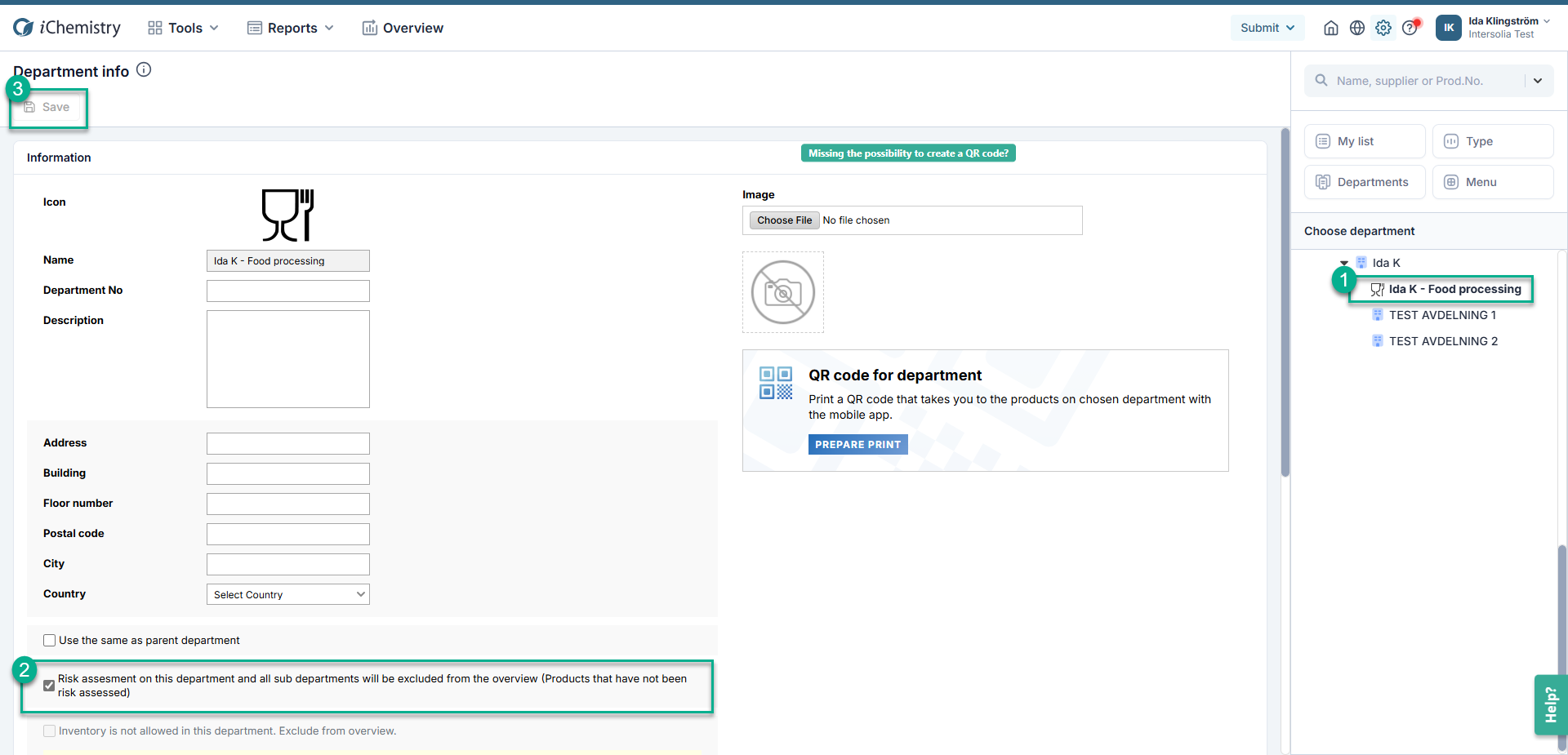 2. Kryss av i boksen " vurdering på denne avdeling og alle avdelinger vil bli ekskludert fra oversikt (Produkter som ikke er risikovurdert)" for å ekskludere avdeling og dens underavdelinger.
