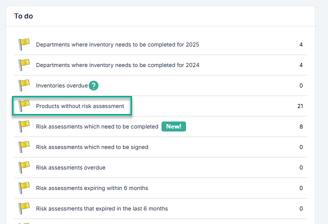 Hvis du har valgt å ekskludere en avdeling fra risikovurdering, vil produktene på den avdelingen ikke bli vist i Oversikt > Å gjøre for "Produkter uten risikovurdering".