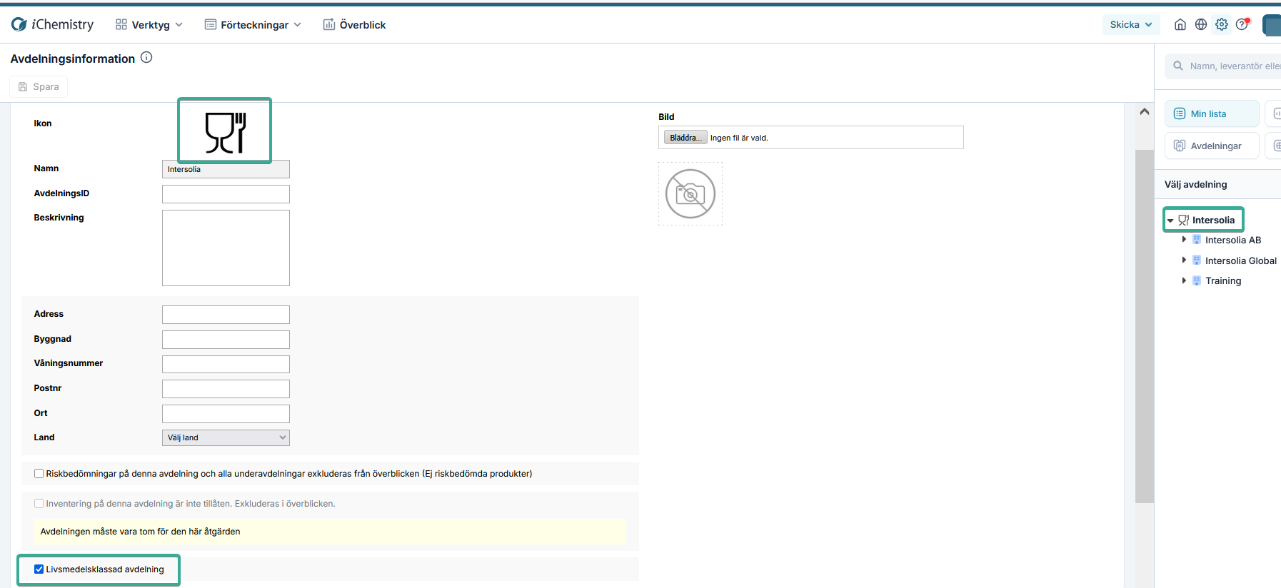 - Avdelningen klassificerad som livsmedelsklassad avdelning kommer att markeras med en ikon i avdelningsträdet.