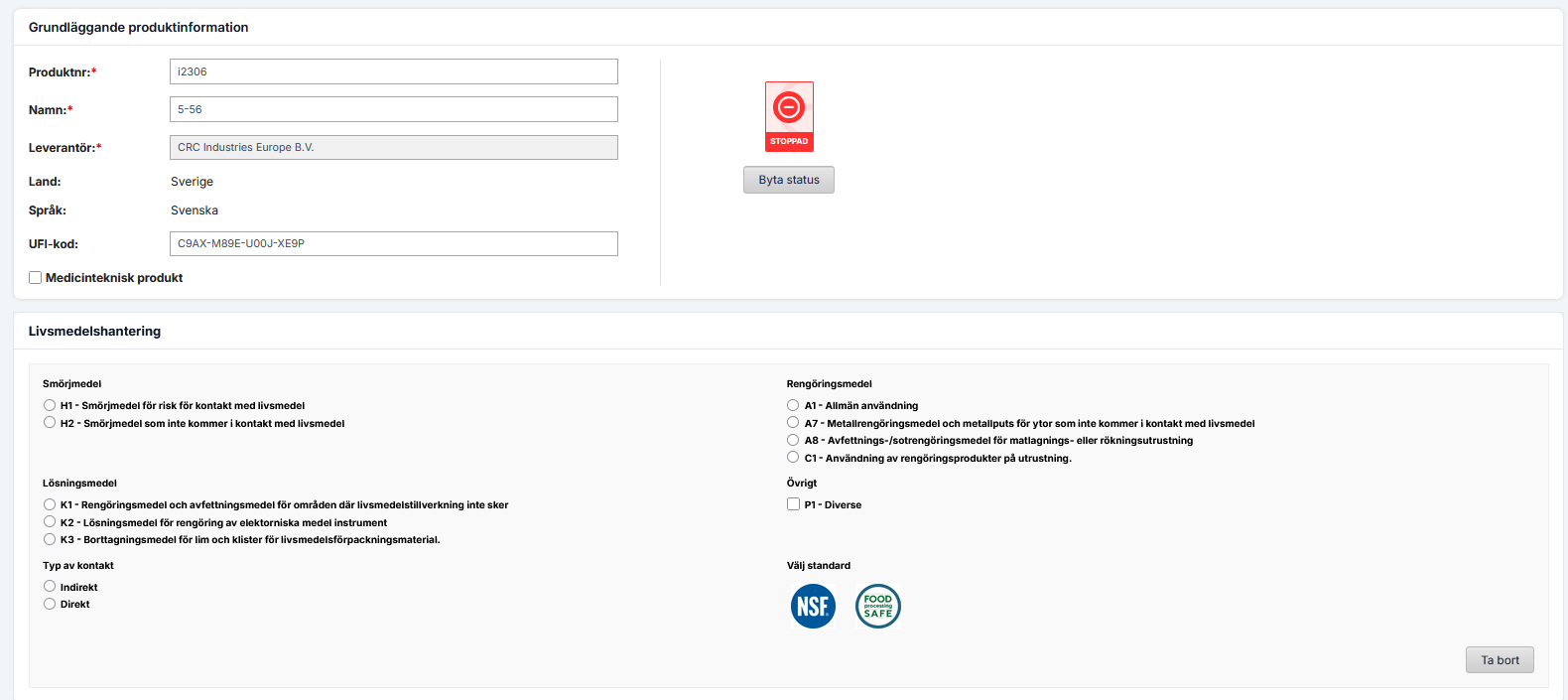 Välj din produkt i den livsmedelsklassade avdelningen och klicka på Redigera. Under grundläggande produktinformation går det nu att kategorisera sin produkt enligt NFS standard.