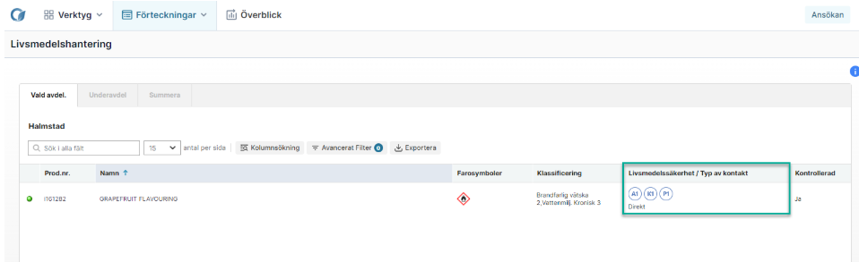 Livsmedelshantering är en funktion där användaren kan klassa avdelningar som livsmedelsklassade avdelningar och produkter med livsmedelsbearbetningskategorier. Detta kan vara allt från smörjmedel i utrustning till ytbeläggning i förpackning. Användaren anger typen av kontakt och användningsområde. (Denna modul hjälper företag som hanterar livsmedel och för uppfylla ISO 22000 krav).