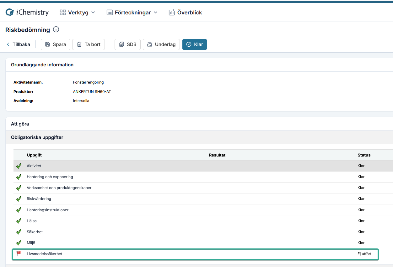 När avdelningen har blivit klassad som en "Livsmedelsklassad avdelning" kommer riskbedömningen ta hänsyn till valet man gjort i avdelningsinformationen och ett nytt obligatoriskt moment i riskbedömningen kommer vara synligt.