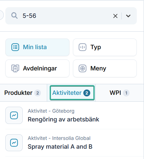 Vanlig sökning (4) visar både aktiviteter och produkter. Att välja alternativet handelsnamn i detaljerad sökning visar endast produkter (5). Att söka på synonymen ”härdare” (6) visar TOLUEN.