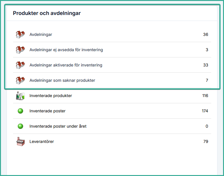 Här är en översikt över hur många avdelningar du har och om det finns några avdelningar som saknar inventerade produkter. Vissa avdelningar skapas enbart för organisationsstrukturen och bör inte innehålla några produkter; dessa kan markeras som inaktiva.