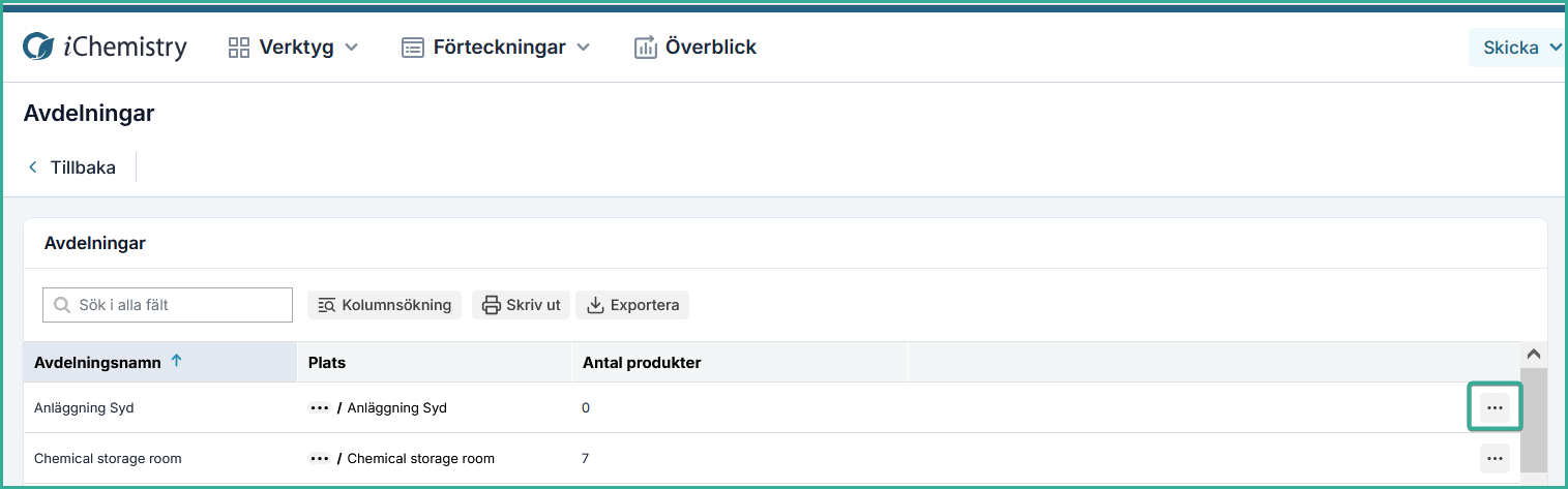 Under varje rubrik kan du gå direkt till "Redigera avdelningsinformation" och "Hantera inventering" med knappen längst till höger i varje avdelningsrad, kallad "Fler åtgärder." Denna funktion ger snabb åtkomst till de mest relevanta åtgärderna för varje avdelning, vilket förbättrar din förmåga att hantera din organisations struktur och inventering smidigt.