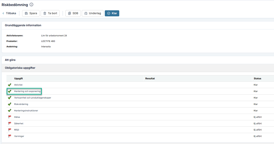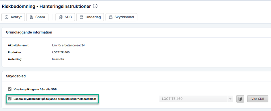 Det produktbaserade skyddsbladet som skapas automatiskt via iChemistry för en produkt, kan användas som ett skyddsblad fram tills att ni har gjort en riskbedömning av aktiviteten/arbetsmomentet. Vi rekommenderar att ni använder er av det aktivitetsbaserade skyddsbladet istället för det produktbaserade skyddsbladet.